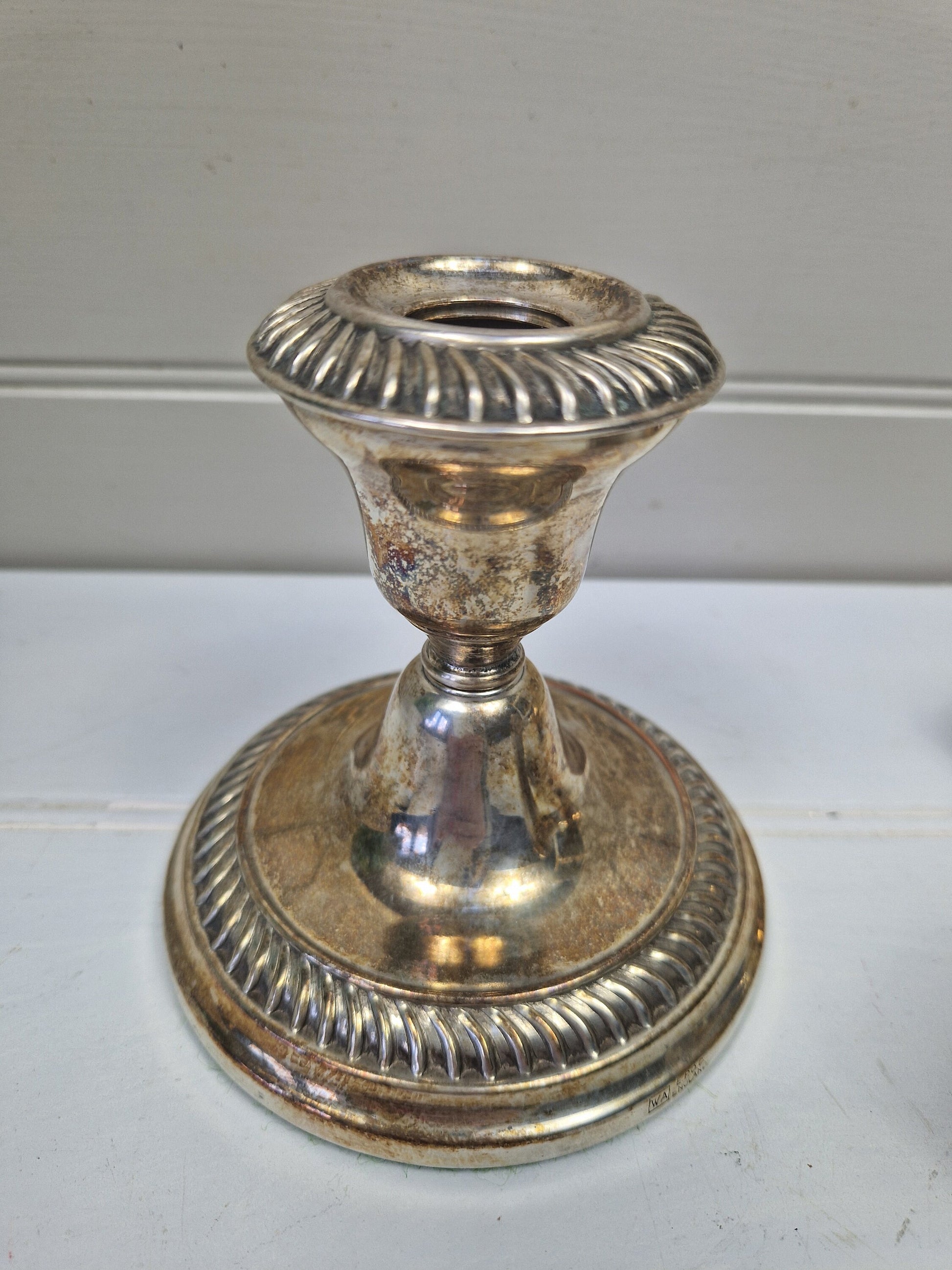 Pair compact William Adams silver plate decorative candlesticks 1950s